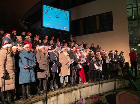 Anschließend ging es weiter zum Theatron des Rathauses, wo bereits die ersten Gäste eintrudelten. Nach einem kurzen Einsingen begann dort das gemeinsame Weihnachtssingen. Zusammen mit drei weiteren Neuenhagener Chören und dem Publikum sangen wir Weihnachtslieder und genossen die harmonische, festliche Atmosphäre.